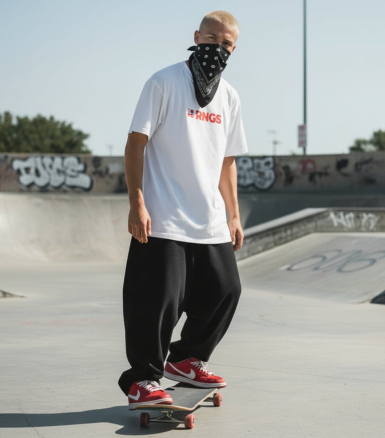 A relaxed-fit tee with set-in sleeves, a no-nonsense 1x1 rib collar, self-fabric neck tape, wide double-needle hems built like they’re expecting impact, and a slightly rougher texture that feels intentionally scrappy—in 100% organic open-end cotton that’s fabric-washed for that “I’ve already lived a little” vibe, shown on a 178 cm model wearing size M like he woke up in it.